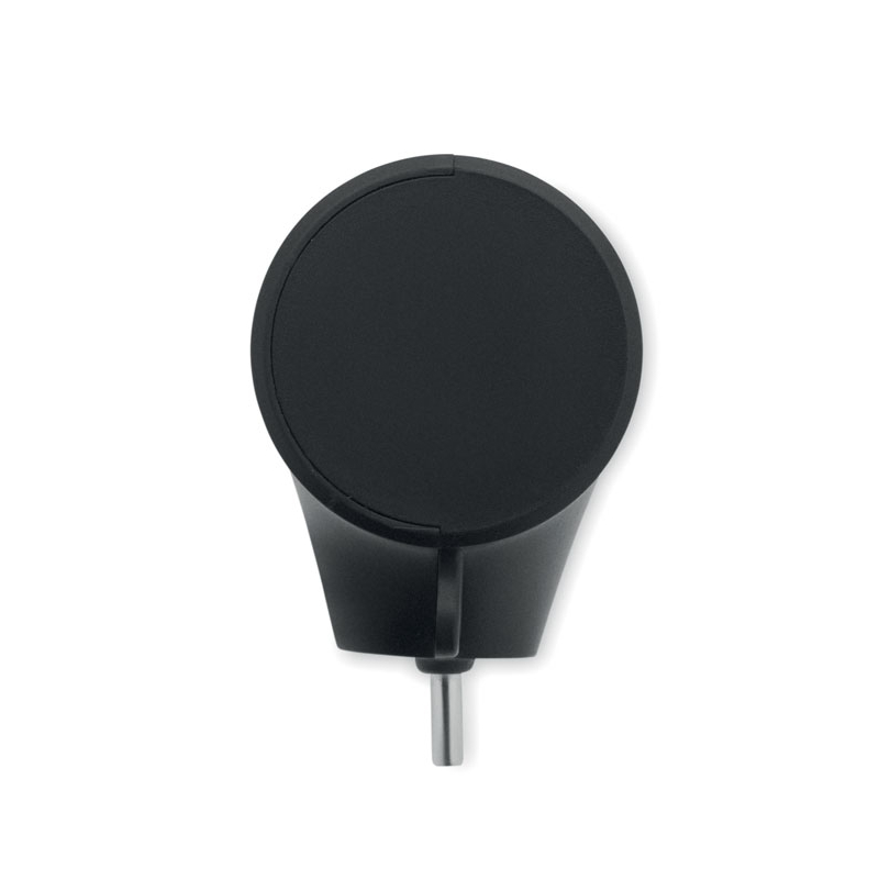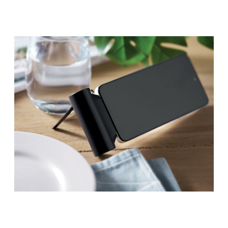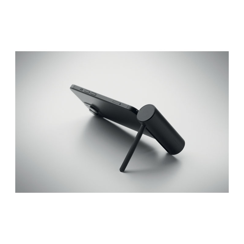 Son boîtier en ABS intègre une fonction support pour smartphone, utilisable sur un bureau ou un stand. Le format cylindrique reste compact et facile à transporter.