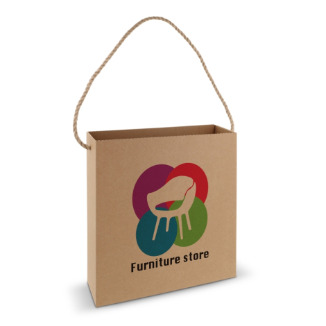 Grâce à sa grande taille (31 x 12 x 31 cm) et ses poignées en papier torsadé, ce sac publicitaire en papier kraft deviendra vite votre nouvelle solution d'emballage durable pour votre enseigne.