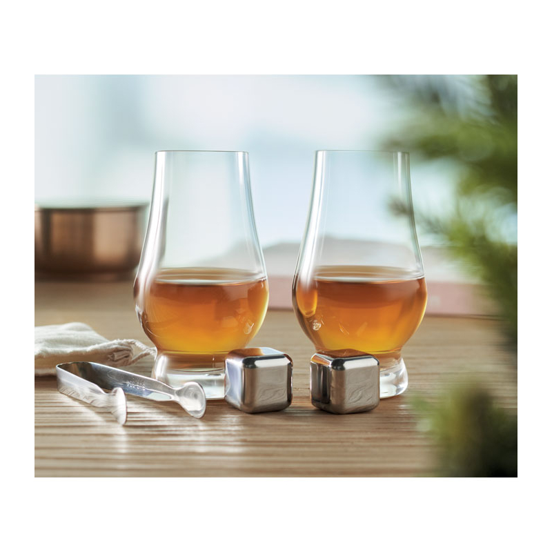 Deux glaçons réutilisables en acier inoxydable assurent un rafraîchissement sans dilution, complétés par une pince métallique pour un service raffiné.
