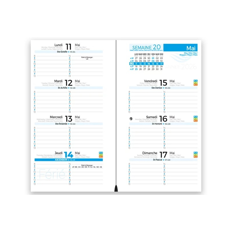 La grille standard de 13 mois est imprimée en quadrichromie et disponible en sept langues. Chaque agenda comprend 128 pages ainsi qu’un Atlas de 16 pages. Les finitions intègrent un pré-millésimé 2026 à chaud avec ruban argent et une micro-perforation des coins pour un usage optimisé.