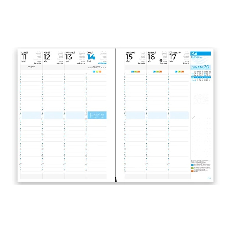 Chaque agenda inclut une grille de 13 mois imprimée en quadrichromie et disponible en sept langues, complétée par 128 pages et un Atlas de 16 pages. Les finitions intègrent la micro-perforation des coins et un millésime personnalisable.