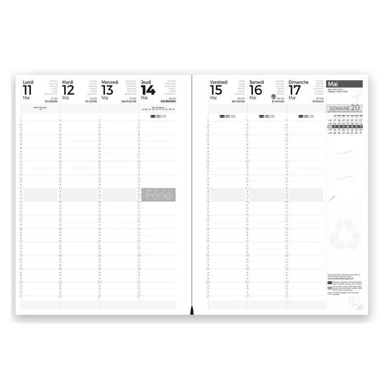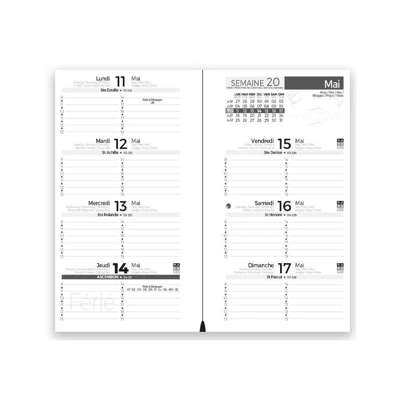 Chaque agenda inclut une grille de 13 mois imprimée en quadrichromie et disponible en sept langues, complétée par 128 pages et un Atlas de 16 pages. Les finitions intègrent la micro-perforation des coins et un millésime personnalisable.