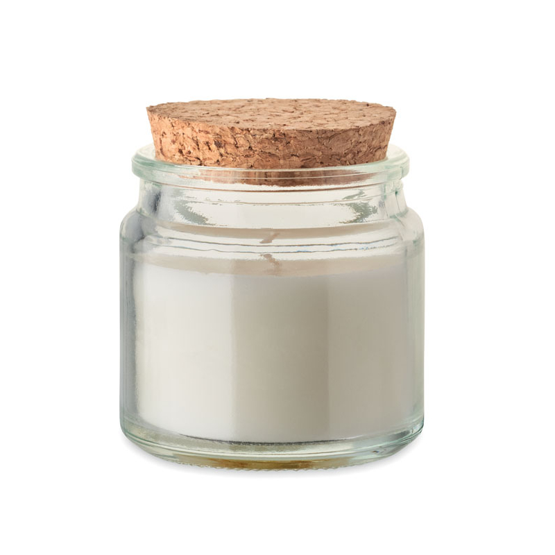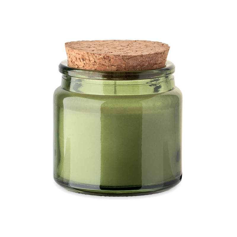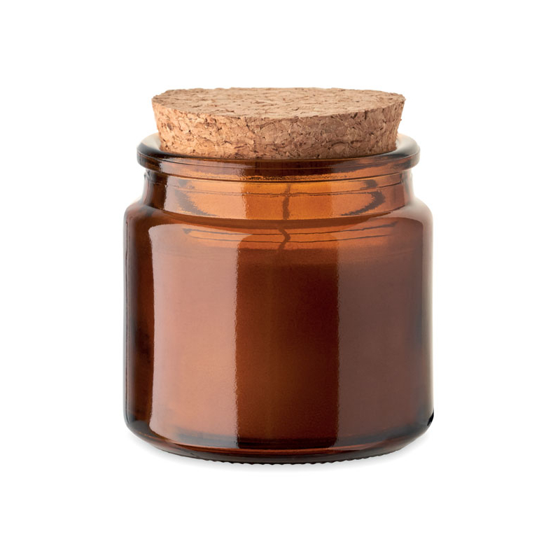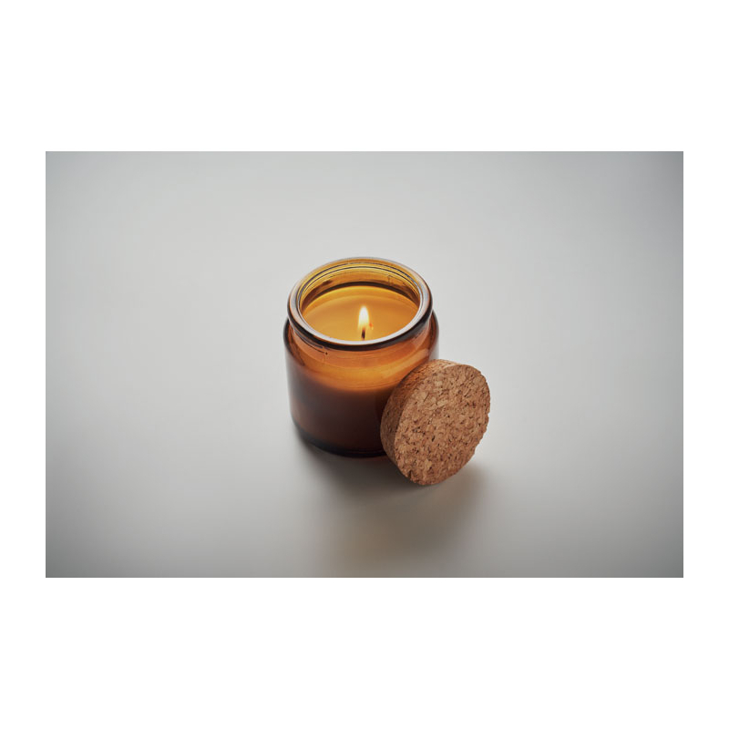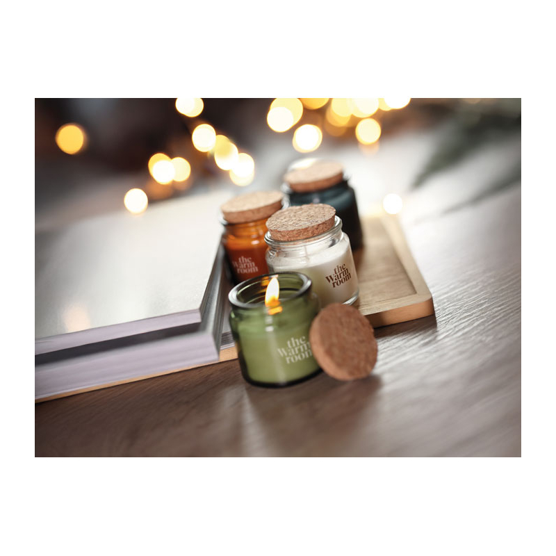 • Matière : cire végétale parfumée vanille, pot en verre teinté, couvercle en liège.