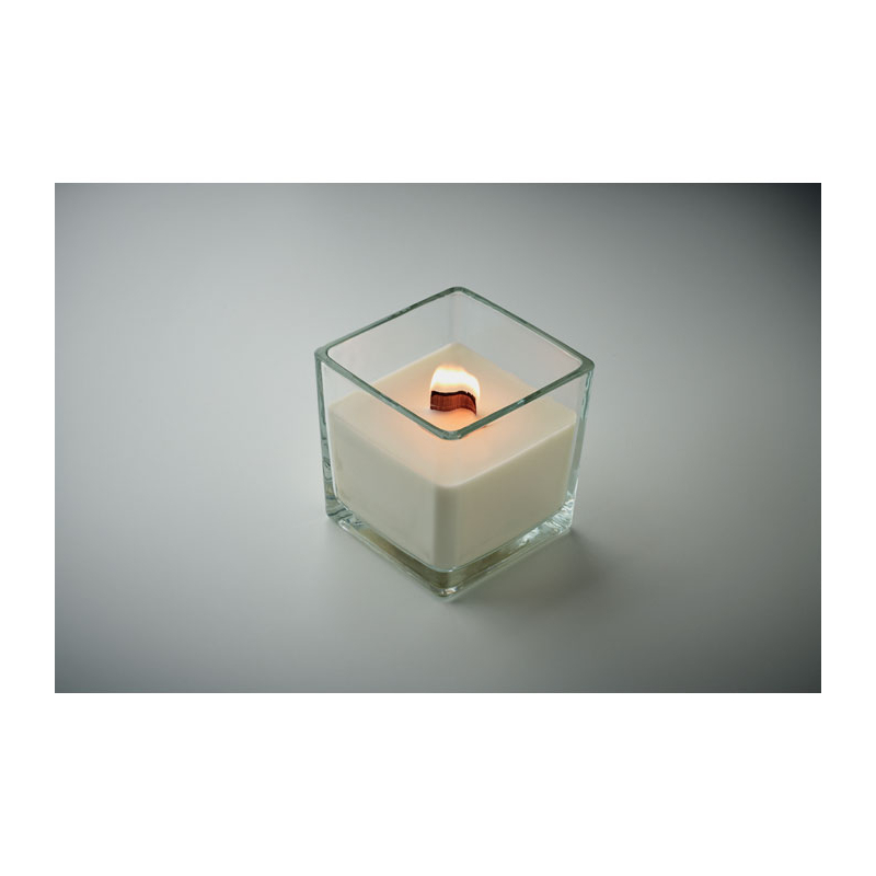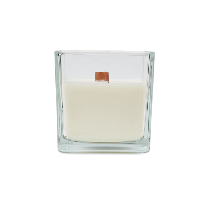 Avec son pot carré en verre transparent et sa mèche en bois, elle diffuse une lumière chaleureuse et contemporaine.