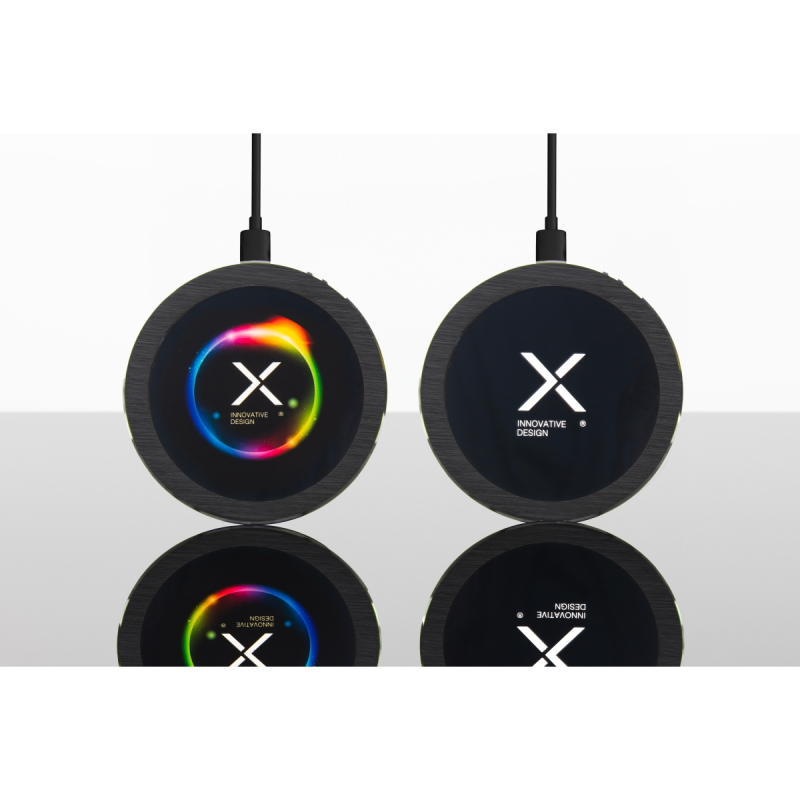 Un chargeur sans fil 15W personnalisable en métal et acrylique, compatible Qi.