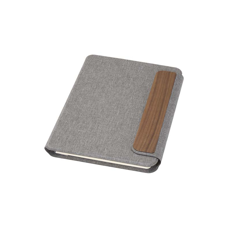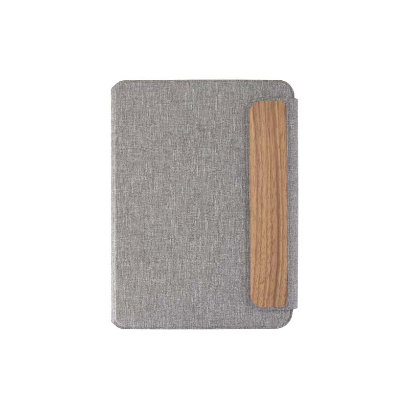Sa couverture rigide grise aux coins arrondis, associée à une fermeture magnétique avec détail en bois de noyer, lui confère un style moderne et raffiné.