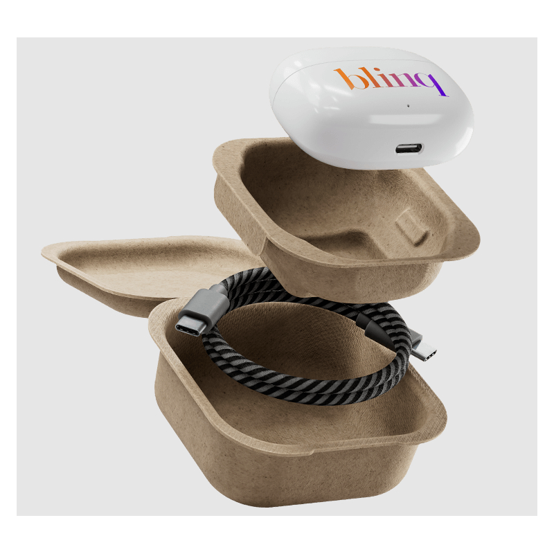 Pratiques à manipuler, ils intègrent un microphone pour les appels et des commandes tactiles intuitives. Leur boîtier personnalisable, associé à un emballage en papier moulé recyclé, en fait un support de communication moderne et responsable.