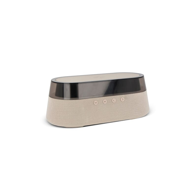 Ce produit combine un haut-parleur 2x5 W, un chargeur sans fil rapide 15 W, un réveil, un thermomètre et une lumière d'ambiance multicolore.