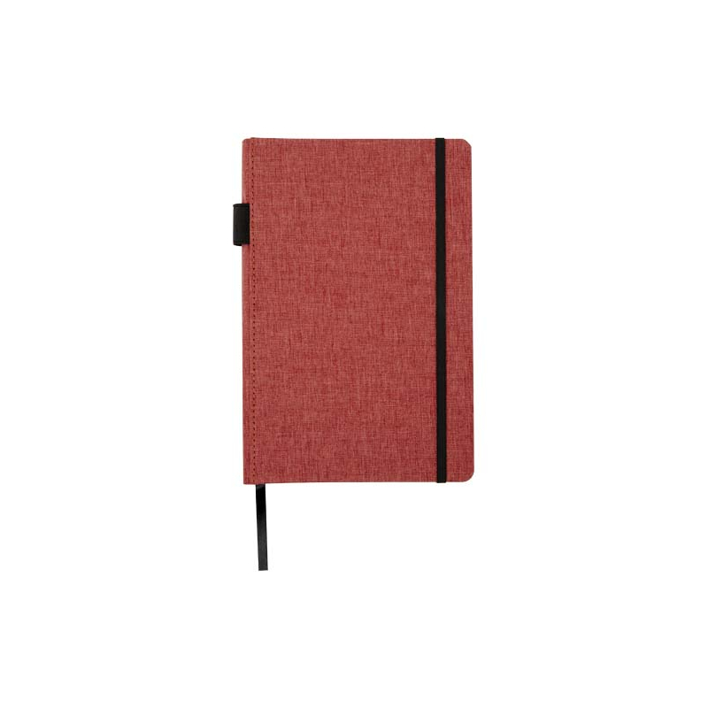 Carnet A5 avec couverture en tissu RPET personnalisable avec votre logo. Comprend 96 feuilles lignées en papier recyclé de 70 g/m², une boucle pour stylo et un marque-page ruban. Emballé dans une pochette en carton.