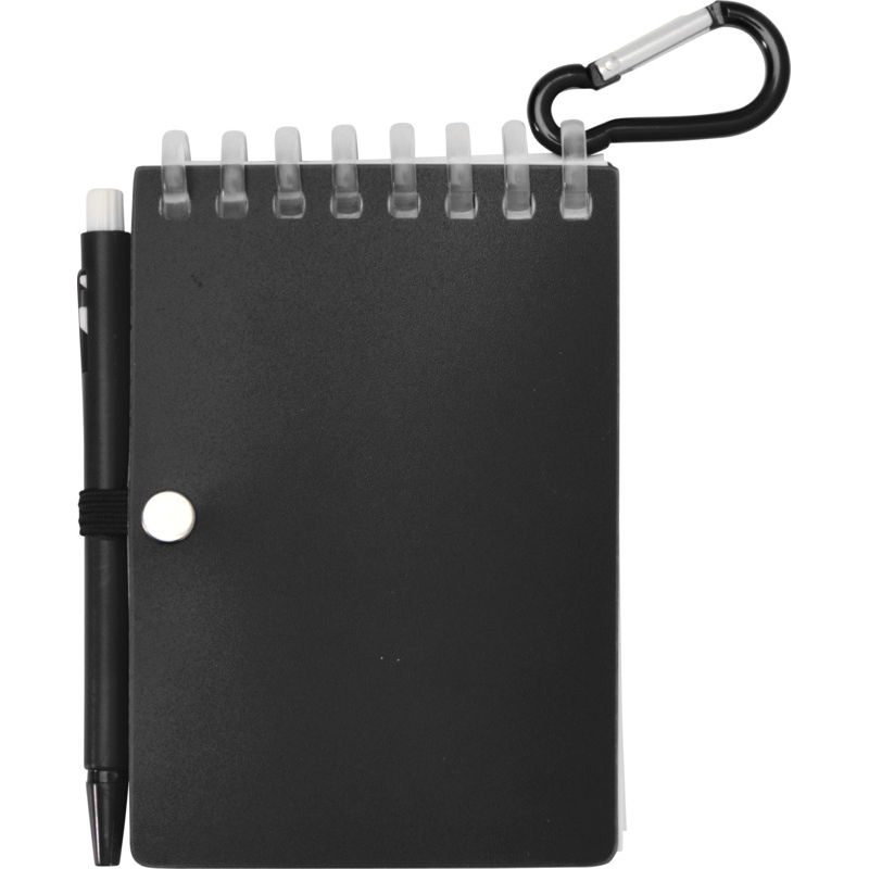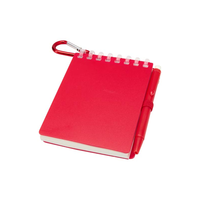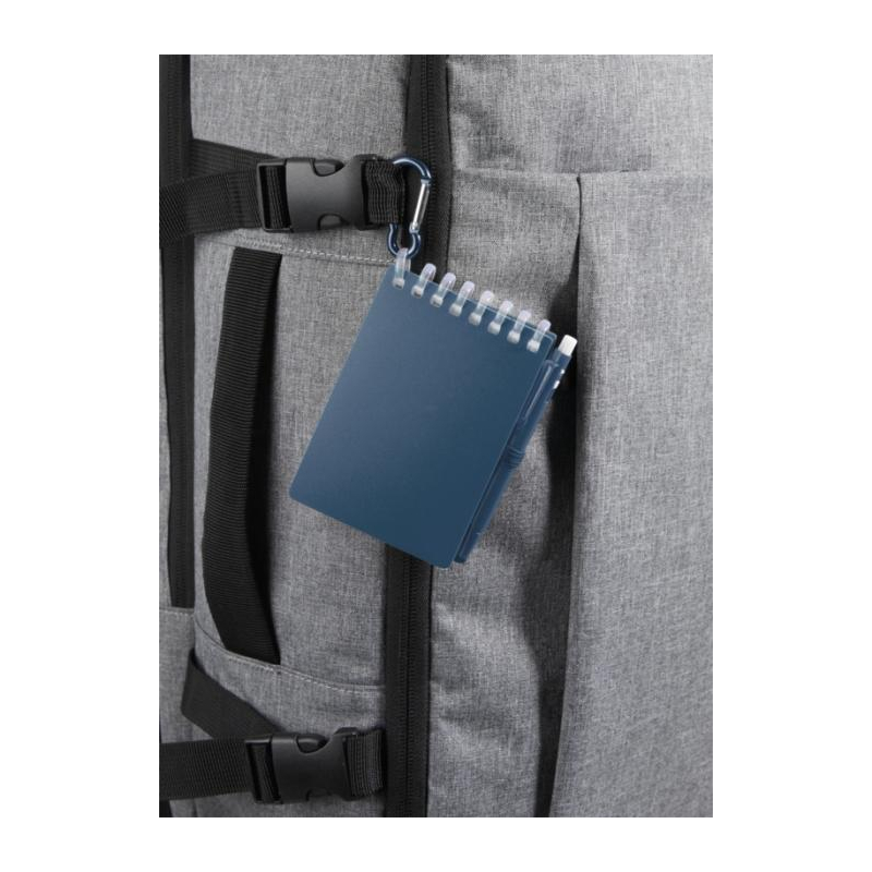 Cet ensemble compact associe un carnet A7 à spirales et un stylo bille assorti, reliés par un anneau métallique d’attache. Son format réduit se glisse facilement dans une poche ou s’accroche à un sac lors de déplacements.