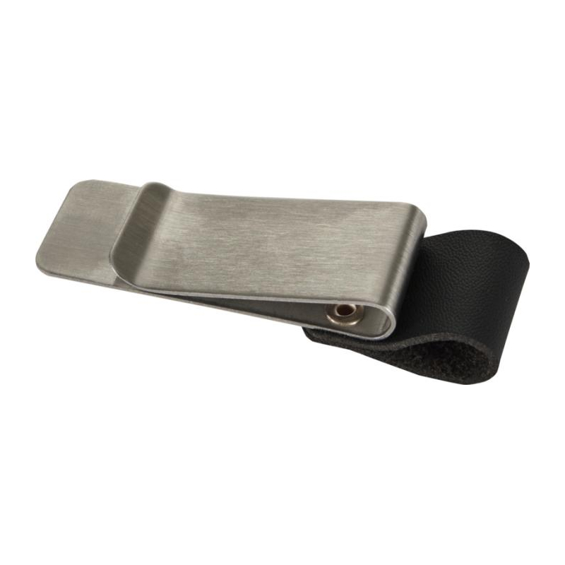 Cette pince à stylo associe une structure en acier inoxydable à un système de maintien souple permettant de fixer un stylo sur la couverture d’un carnet. Son format compact s’intègre discrètement aux supports de prise de notes.
