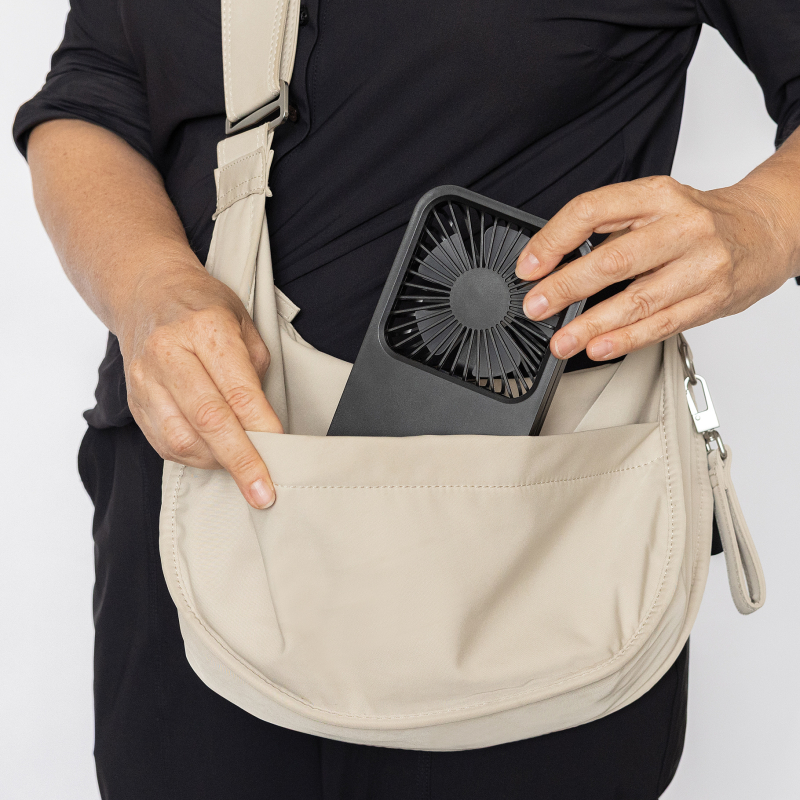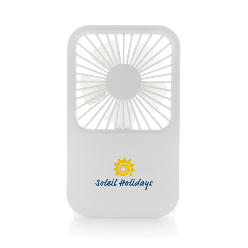 Pensé pour une utilisation sur poste de travail ou en déplacement, ce ventilateur s’intègre facilement dans les espaces professionnels. Sa face avant permet d’accueillir un marquage visible en continu, offrant une présence stable de votre identité visuelle.