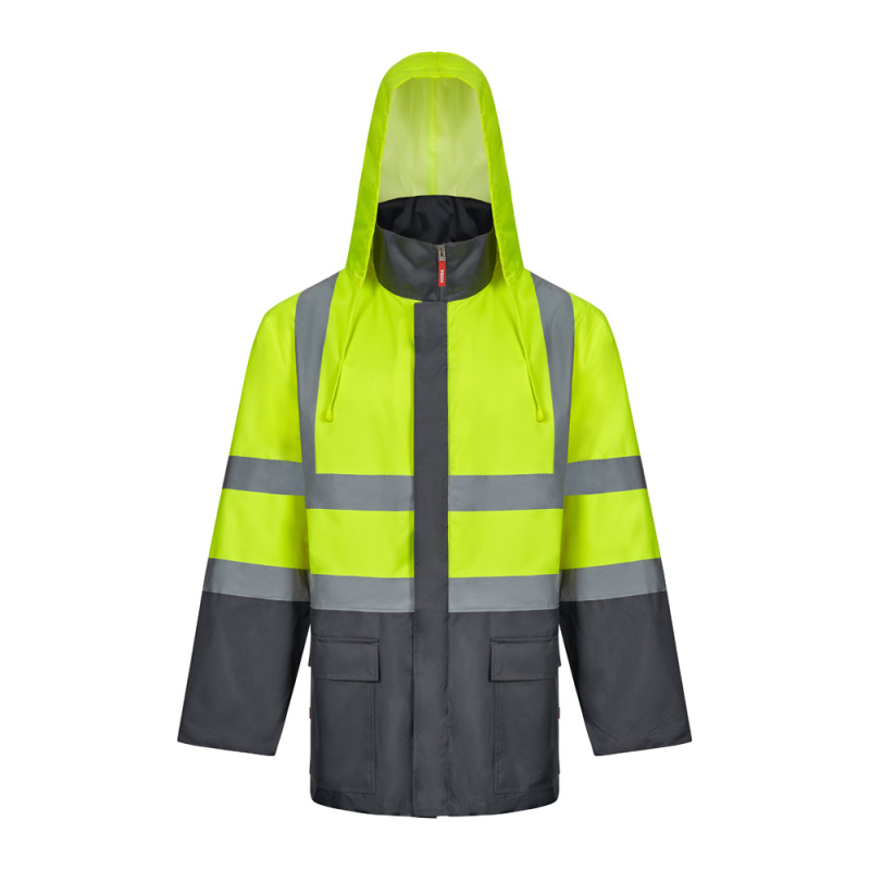 Cette parka 4 en 1 bicolore 180 g/m² en polyester avec finition PU offre une modularité exceptionnelle : parka, imperméable, veste ou gilet. Chaque configuration garantit une visibilité optimale grâce aux bandes réfléchissantes sur le torse, les épaules et les manches.