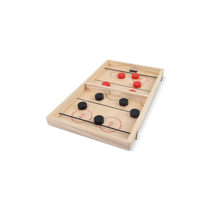Ce modèle Sling Puck invite deux joueurs à propulser leurs palets à travers l’ouverture centrale, dans une partie où rapidité et précision font toute la différence.