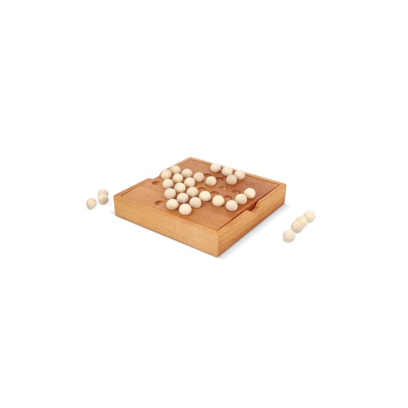 • Jeu de solitaire en bois avec plateau percé et billes assorties.