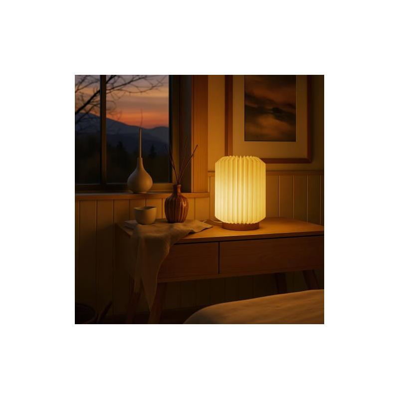Une lampe LED personnalisée Coollux Aurore en papier pliable avec socle en bois.