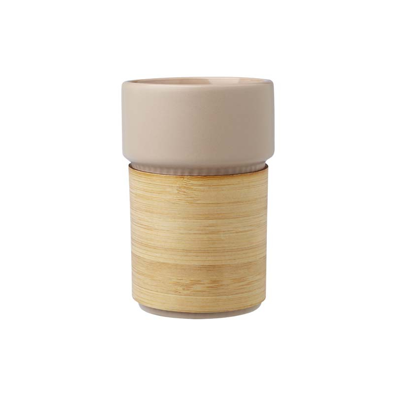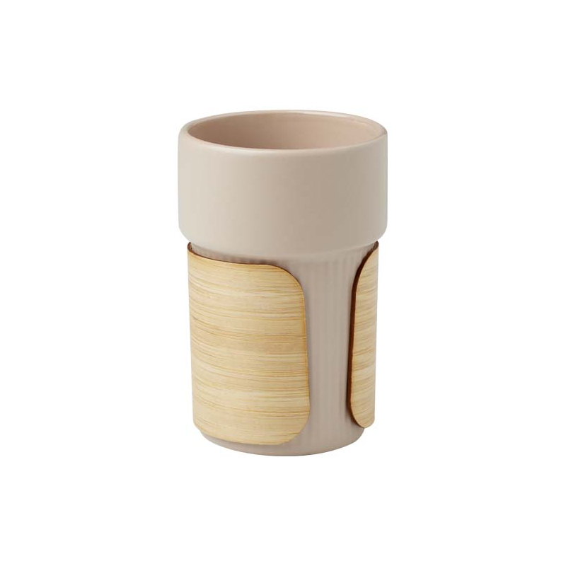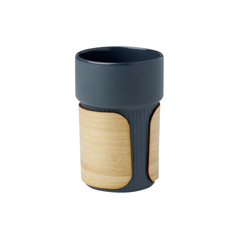 Découvrez ce gobelet publicitaire élégant en grès avec manchon amovible en bambou, idéal pour déguster vos boissons chaudes en étant protégés de la chaleur.