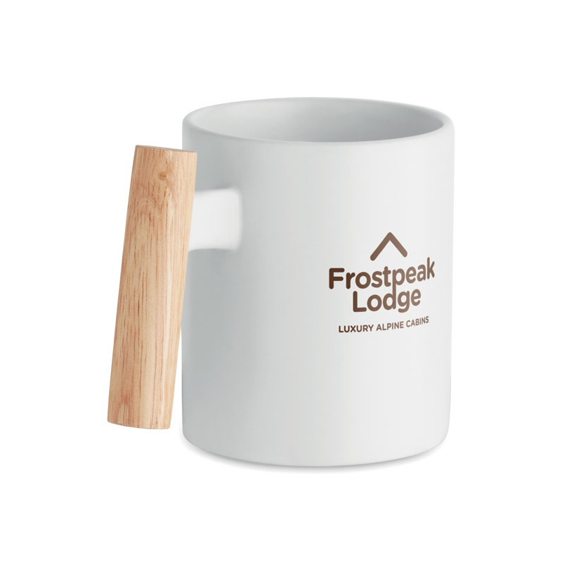 • Zone(s) / Position(s) de marquage : sur toute la circonférence du mug ; sur la face avant du mug côté droitier ; sur la face avant du mug côté gaucher ; sur l’anse en bois.