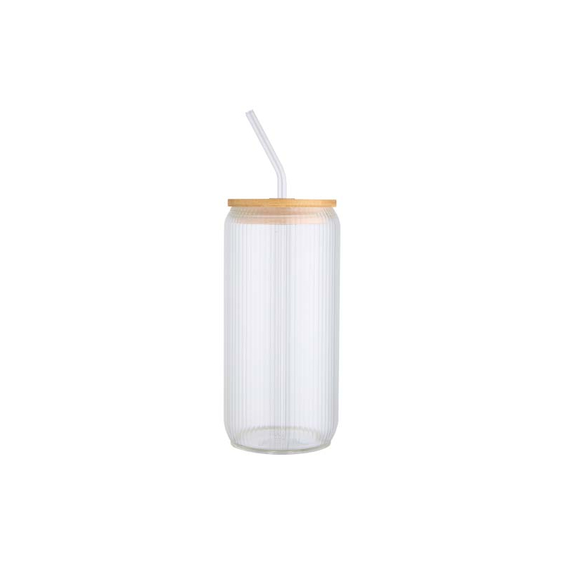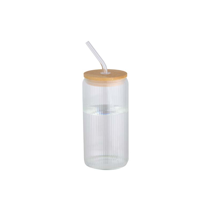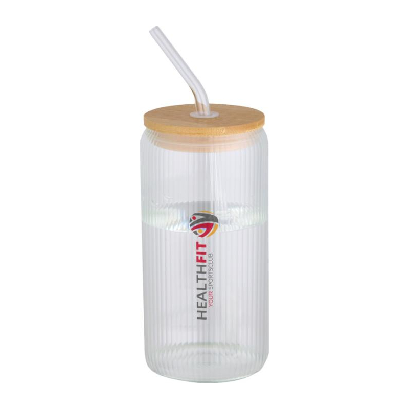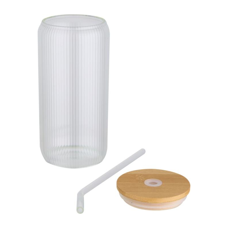 Son corps en verre borosilicate combine résistance thermique et design nervuré interne, tandis que la surface extérieure lisse offre un rendu de marquage net et qualitatif. Le couvercle en bambou issu de ressources gérées durablement, associé à la paille en verre incluse, apporte une touche naturelle et durable appréciée dans les environnements professionnels.