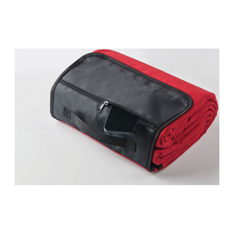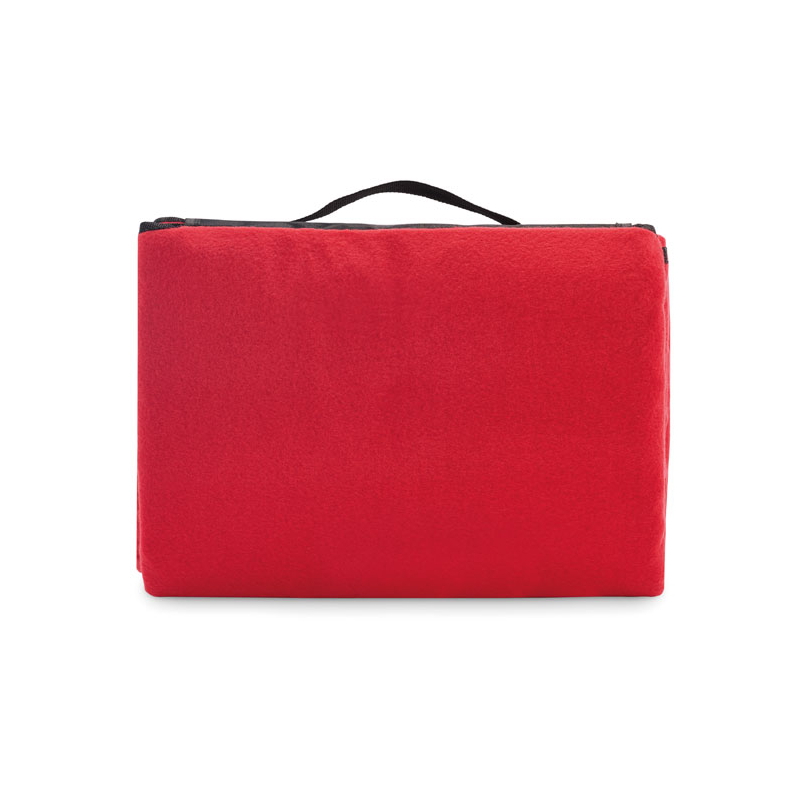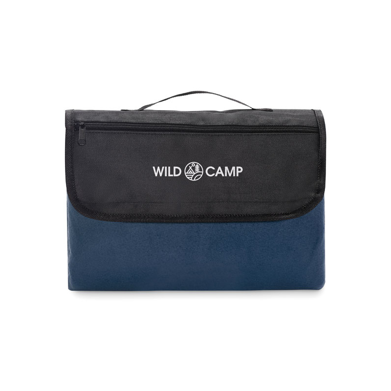 La face supérieure en polaire RPET 150 gr/m² (68 % polyester recyclé / 32 % polyester) est associée à un envers en PEVA enduit résistant à l’eau. Une fois pliée, elle se transforme en format rectangulaire compact avec rabat frontal et poignée intégrée.