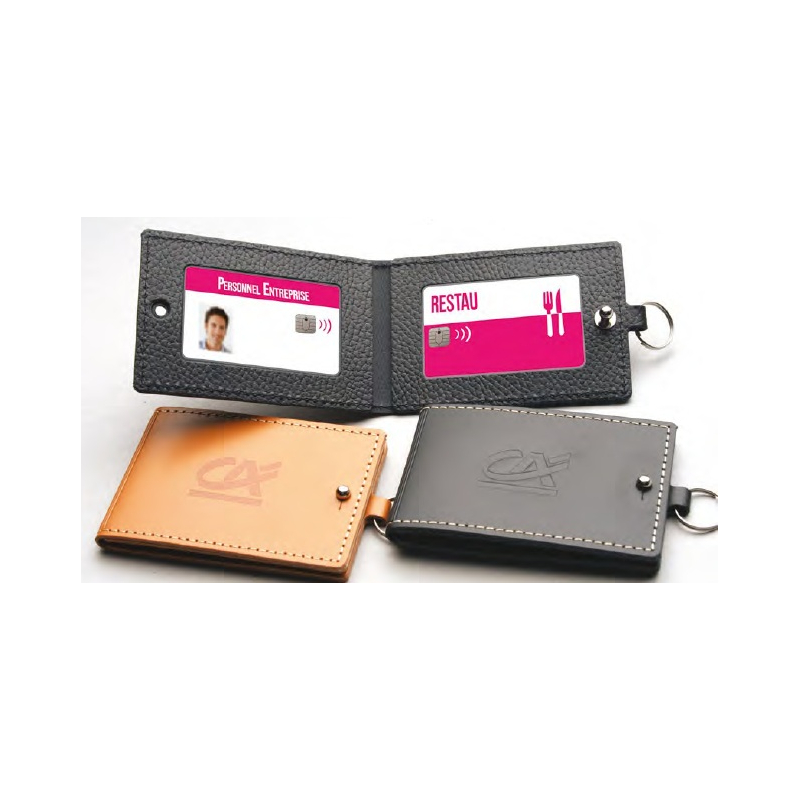 Réalisé en cuir régénéré, il associe résistance, esthétique et finition qualitative. Son format double fenêtre permet d’afficher deux cartes ou badges, tout en conservant une présentation nette et professionnelle.