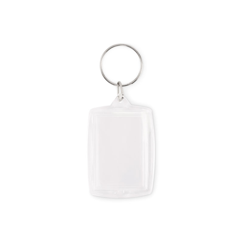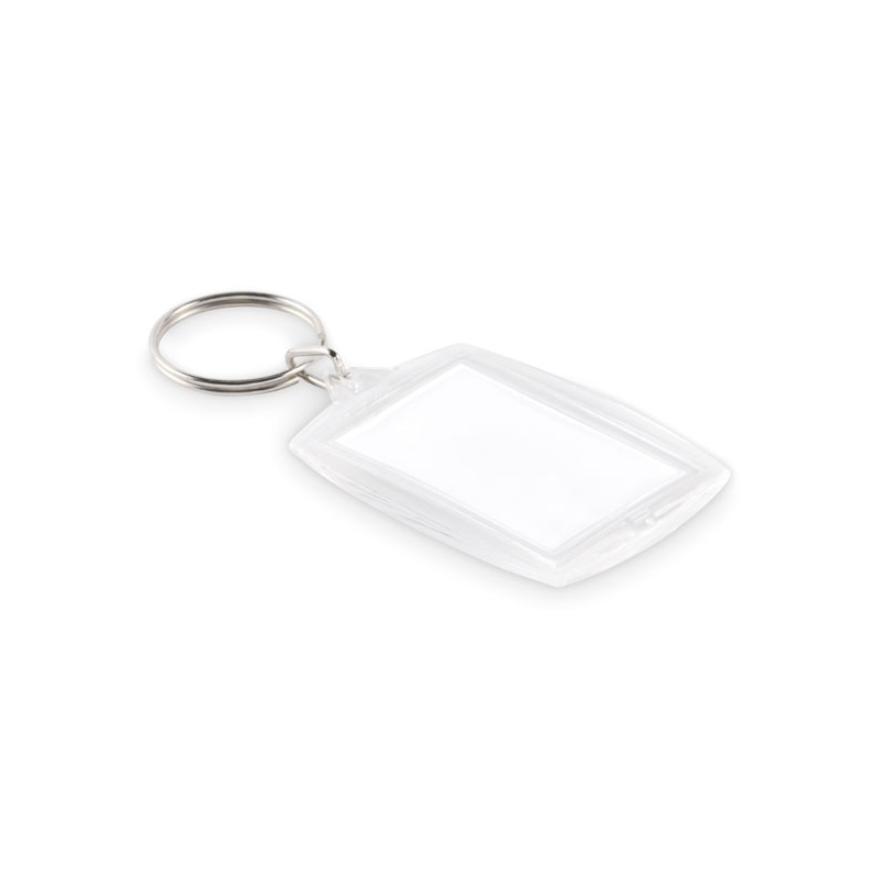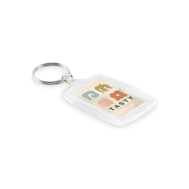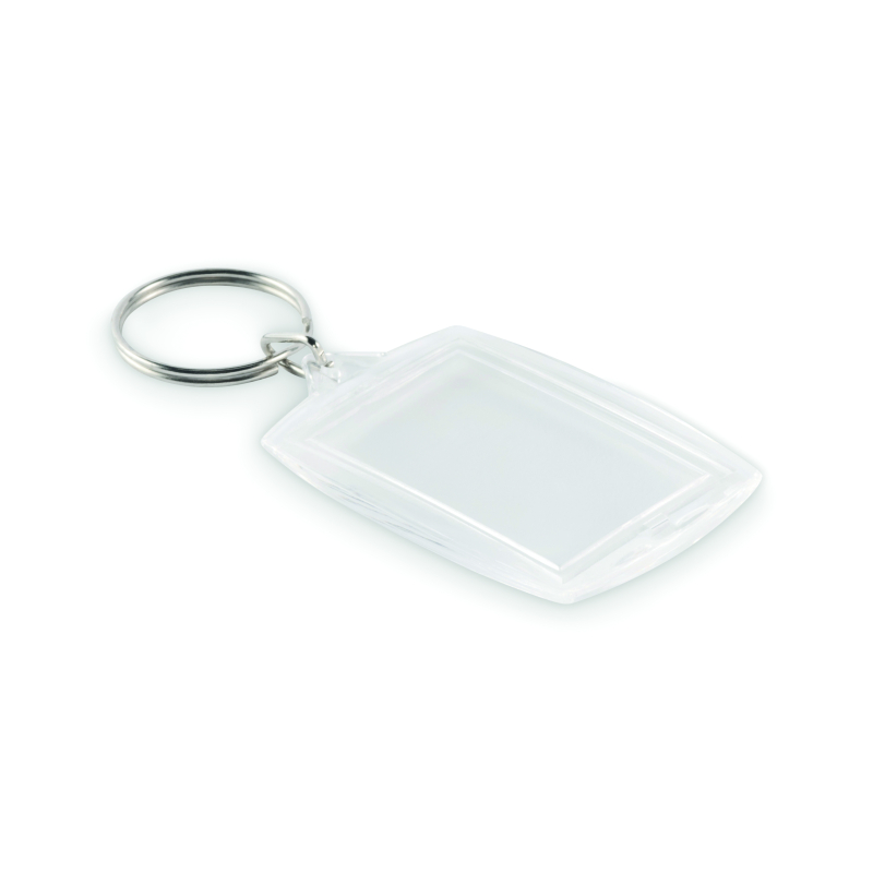 Ce porte-clés photo personnalisé se distingue par sa structure en acrylique transparent, conçue pour accueillir une image ou un papier visible. Il devient un support de communication intime, associé à un usage personnel et répété.