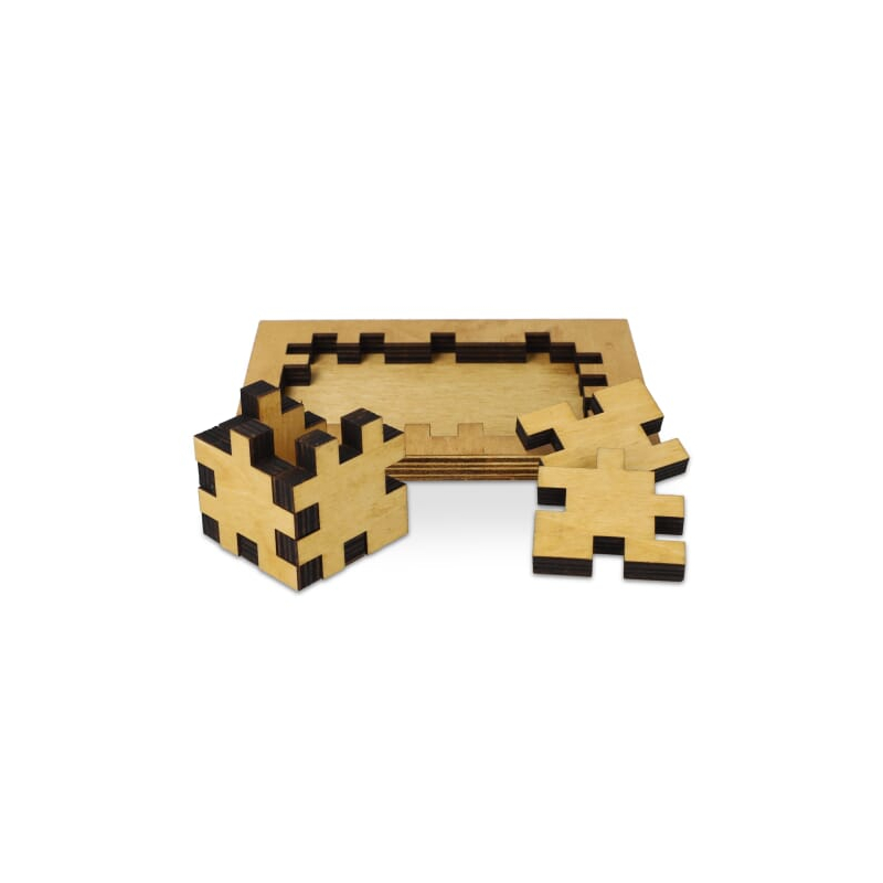Ce jeu d’esprit se compose de six pièces en bois qui s’assemblent pour former un cube ou se rangent à plat sur leur support. Simple à manipuler, il offre une expérience ludique qui s’intègre naturellement dans un bureau, une salle d’attente ou un espace d’accueil.