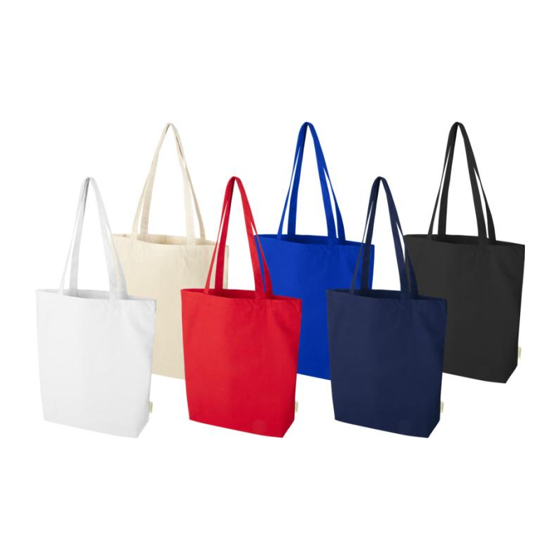 Ce sac shopping en coton biologique certifié OCS 180 g/m² se distingue par sa base élargie qui lui confère une tenue plus structurée qu’un simple sac plat. Il accompagne naturellement vos opérations retail, institutionnelles ou événementielles.
