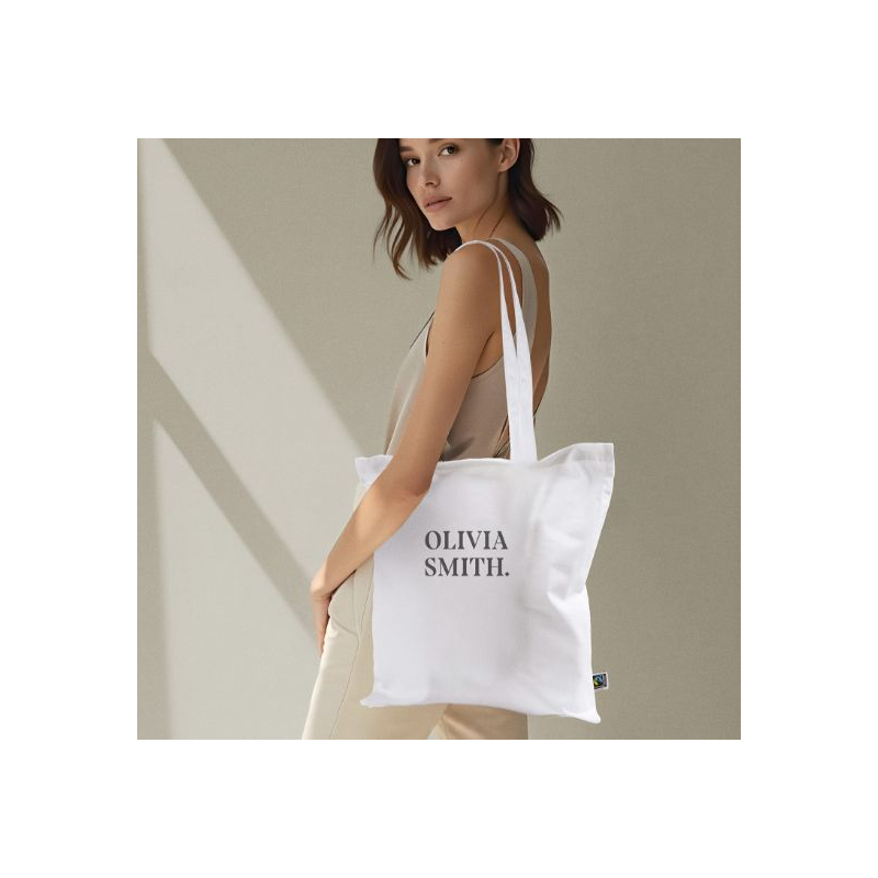 Réalisé en coton Fairtrade 140 g/m², ce modèle combine praticité et engagement éthique. Ses longues poignées facilitent le port à l’épaule, tandis que sa capacité jusqu’à 6 kg en fait un allié fiable pour le quotidien comme pour les événements professionnels.
