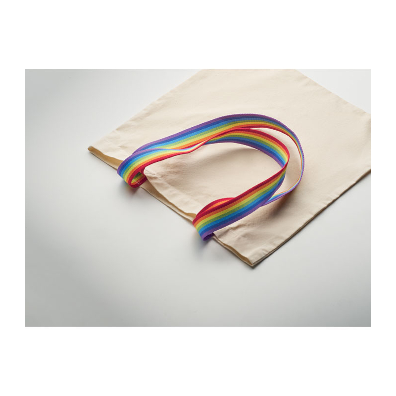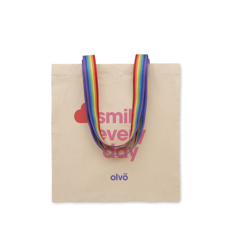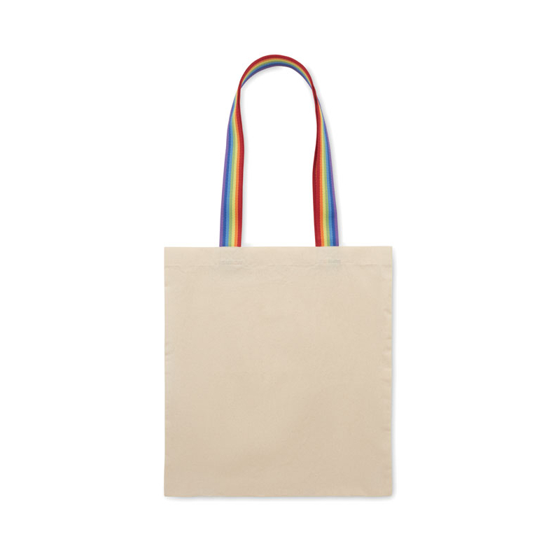 Le sac shopping Aurora en coton 180 gr/m² associe une toile écrue à des anses longues aux couleurs arc-en-ciel. Son format 38 x 42 cm offre une surface frontale large, idéale pour afficher votre identité visuelle.
