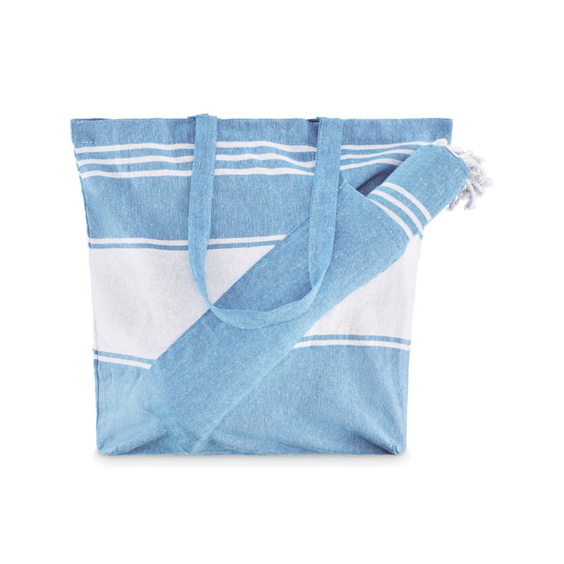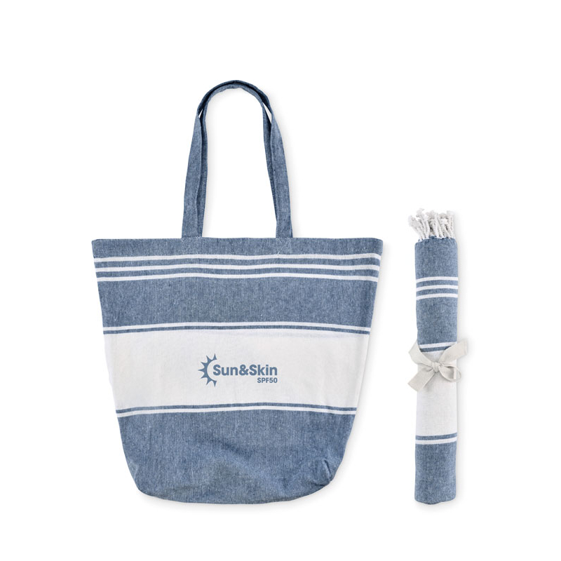 Le cabas à longues anses accueille une serviette type hammam assortie, présentée avec franges et bandes tissées. L’ensemble bicolore crée une cohérence visuelle propice à une personnalisation visible.