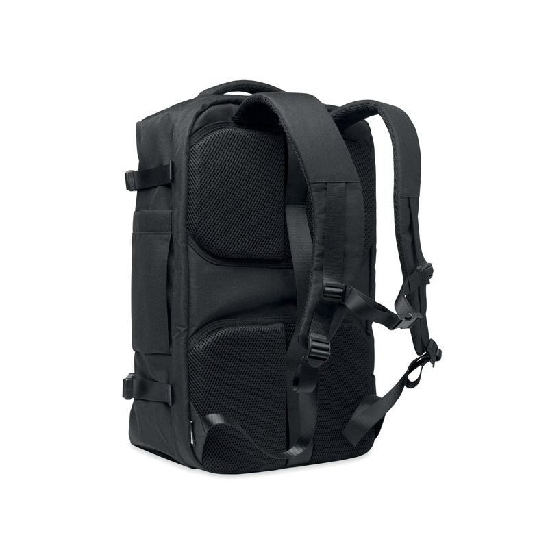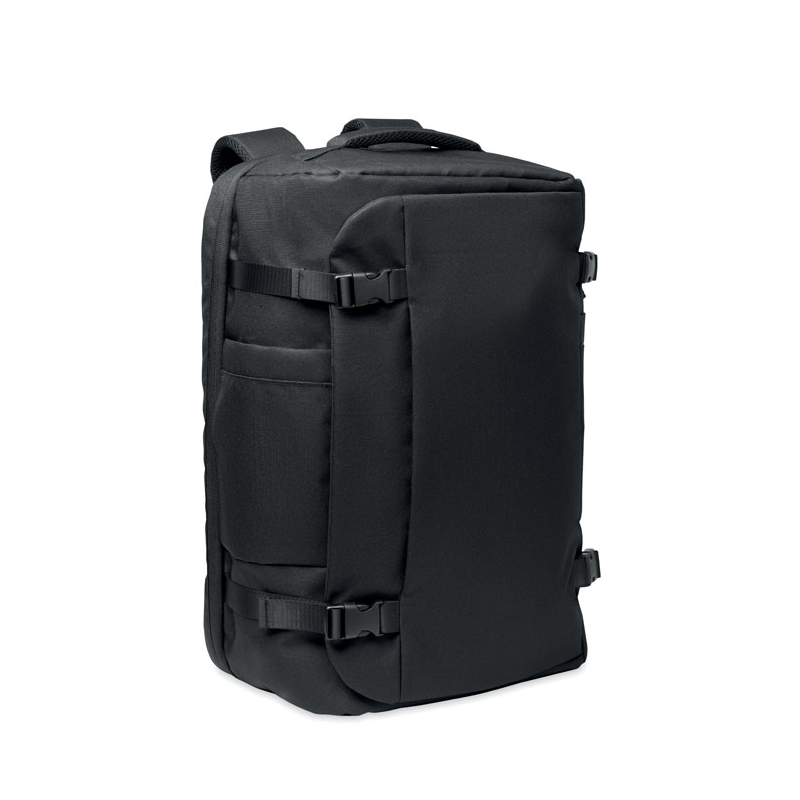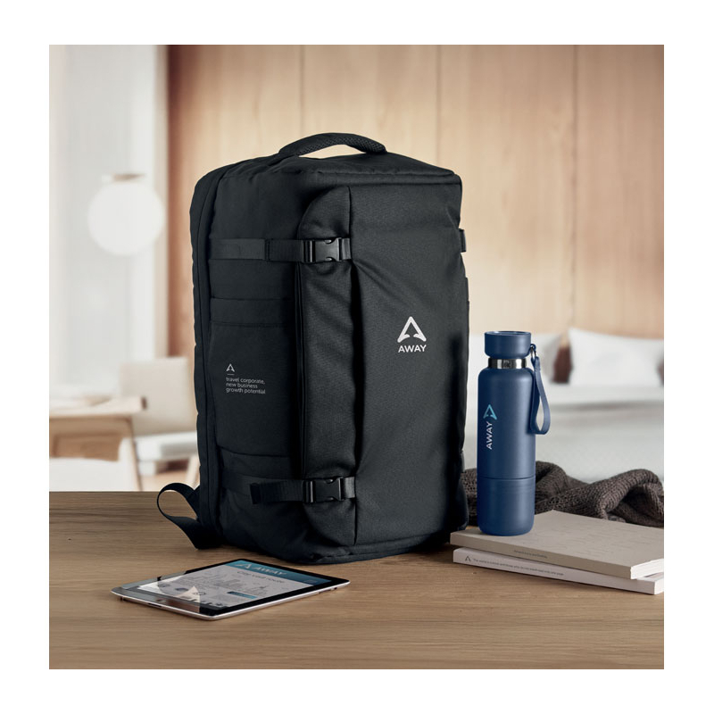Conçu en polyester 600D RPET, ce sac combine robustesse et démarche responsable. Son grand compartiment principal accueille les vêtements, complété par deux compartiments matelassés pour ordinateur portable 17’’ et tablette.