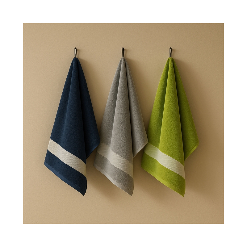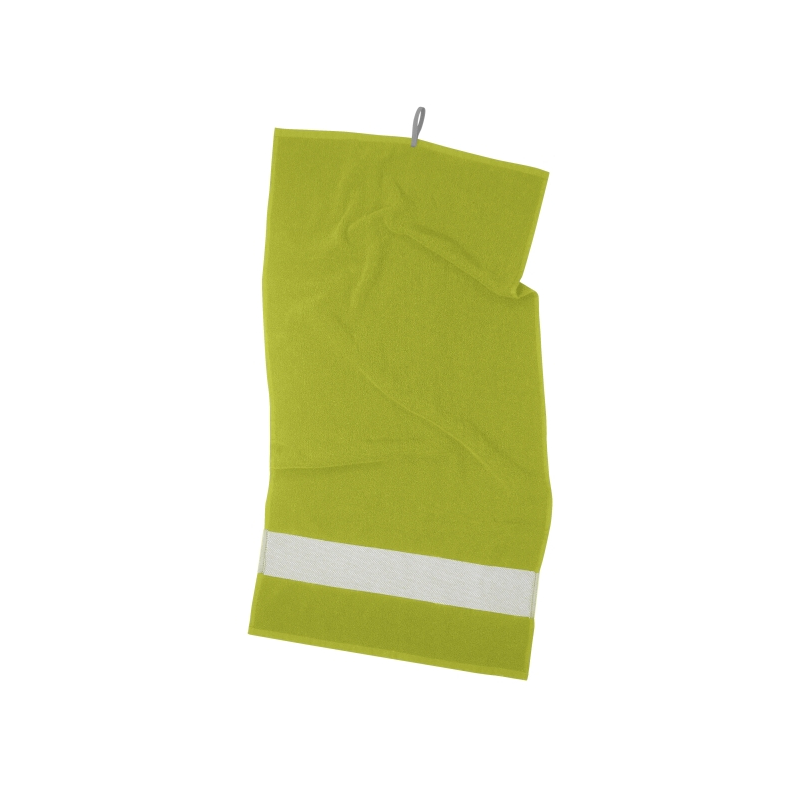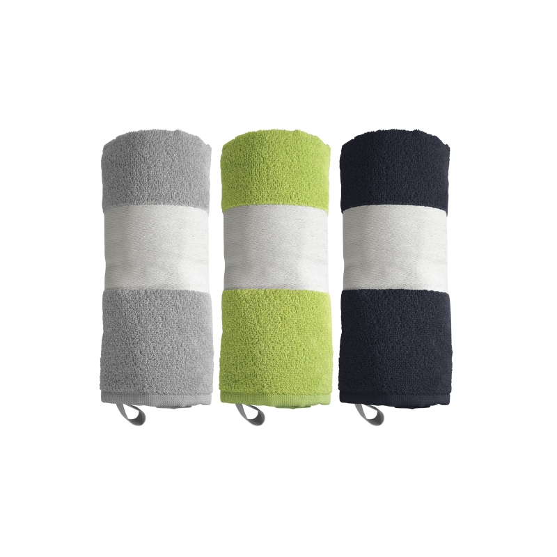 Serviette de sport promotionnelle en coton recyclé 400gr/m2 certifié GRS fabriquée en Europe. Personnalisez cette serviette roulée sous élastique et offrez-la à vos clients et collaborateurs pour être visible à tout moment !