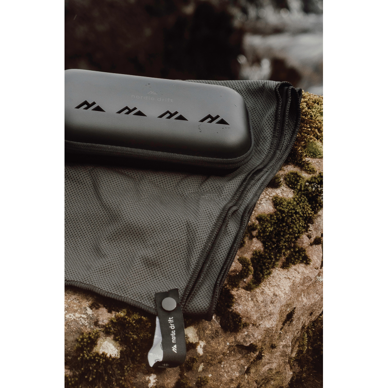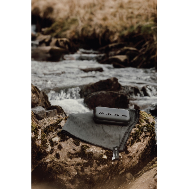Son tissu léger en polyester recyclé favorise une absorption rapide et un séchage efficace. Sa pochette de transport avec mousqueton permet de la fixer facilement à un sac, facilitant son transport et son accessibilité.