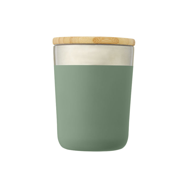 Petit gobelet isotherme personnalisable à double paroi avec couche de cuivre. Design moderne avec un couvercle en bambou.
