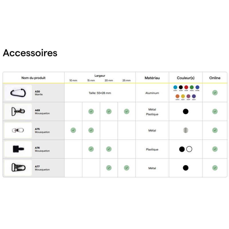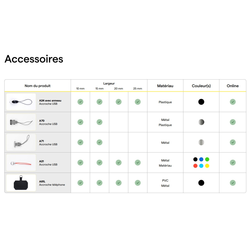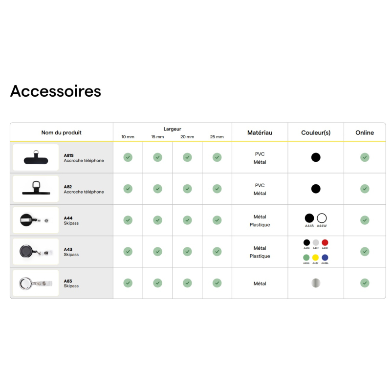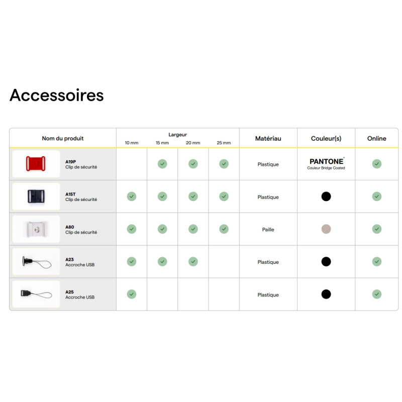 • Nombreux accessoires disponibles sur devis (skipass, mousqueton, crochet, boucle détachable, clip de sécurité, accroche USB, accroche téléphone, poignée, anneau, porte-badge, etc.).