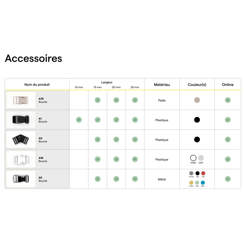 Disponible en 20 ou 25 mm de large, il est fourni avec une boucle métallique et se décline en plusieurs matières et coloris pour s’adapter à chaque projet.